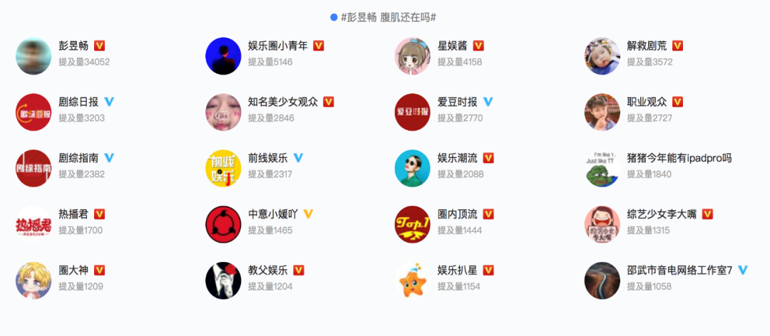 更重要的是,微博独特的延伸能力能让话题不再阅后即焚。如今用户每天接触到的信息不计其数,在很多平台,用户都停留在消费热点层面,阅后即焚。而在微博,用户会参与到娱乐话题的发酵过程中,娱乐大账号的扩散和吃瓜群众的每一次转评赞能进一步助推舆论热潮。Keep此次活动中,@娱乐小青年、@教父娱乐、@星娱酱等娱乐KOL关注到综艺热点以及#彭昱畅 腹肌还在吗#话题,纷纷发博和粉丝一起催促彭昱畅gkd(搞快点)。他们的参与使话题进一步扩散到了泛娱乐圈层。