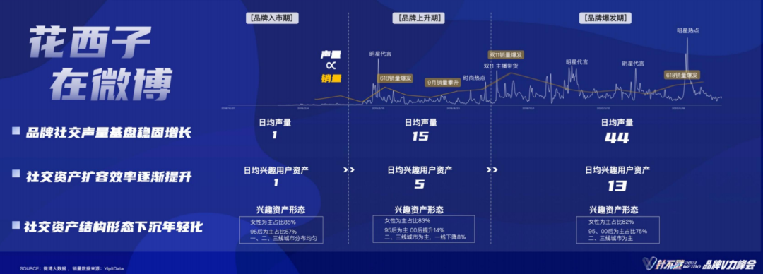 “在三年前初入市场时,花西子已经开始在微博进行品牌经营,邀请一大批品牌种草官参与品牌共创,请他们对产品提意见,并据此做出改进。持续的内容营销,让花西子在上升期,微博声量成长15倍,日均兴趣用户资产增长5倍。”对微博来说,观察兴趣用户,就可以看到一个品牌的影响力和用户黏性。