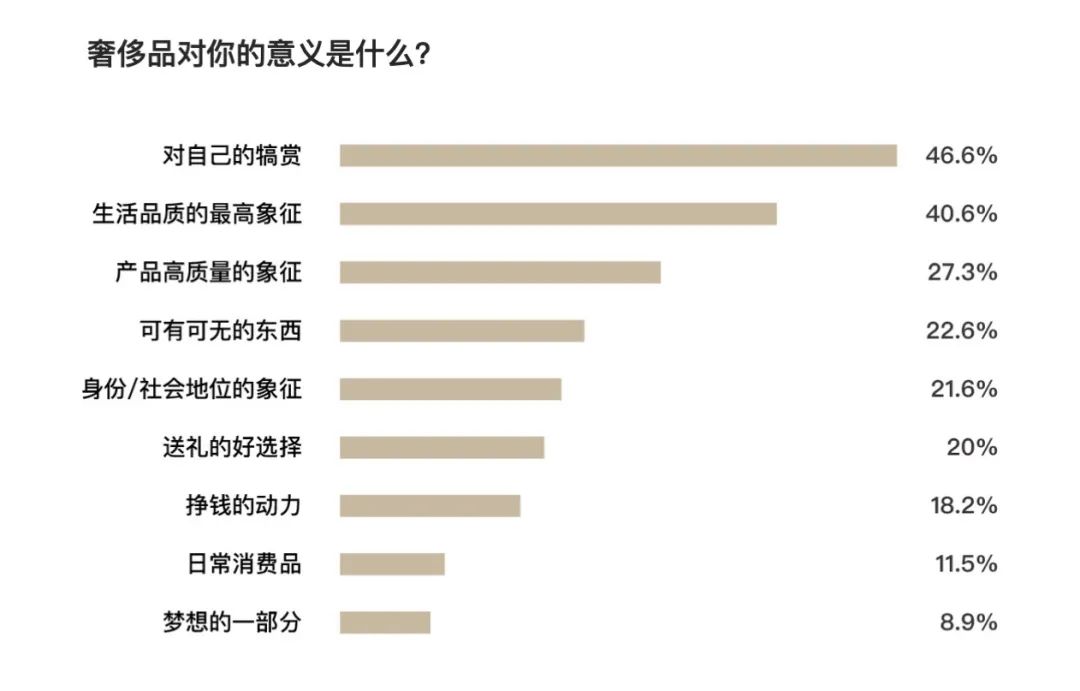 奢侈品的意义是什么?在这个问题中,仅有21.6%的奢侈品消费者认为是“身份/社会地位的象征”,排名明显靠后,其中排名最高的是“对自己的犒赏”(46.6%)和“生活品质的最高象征”(40.6%)。