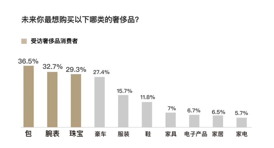 女性未来最希望购买的奢侈品类别中,除了包袋(46.2%),珠宝和腕表紧随其后,分别占比38.3%和28.4%。