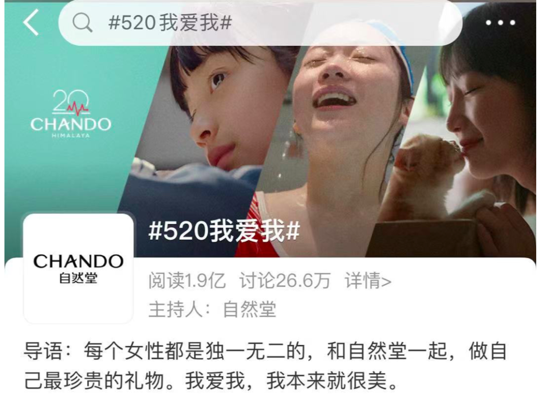 自然堂提出#520我爱我#在歌颂爱的日子,独辟蹊径,歌颂女性的独立,表达每个女性都是独一无二,我本来就很美,引起情绪共鸣。