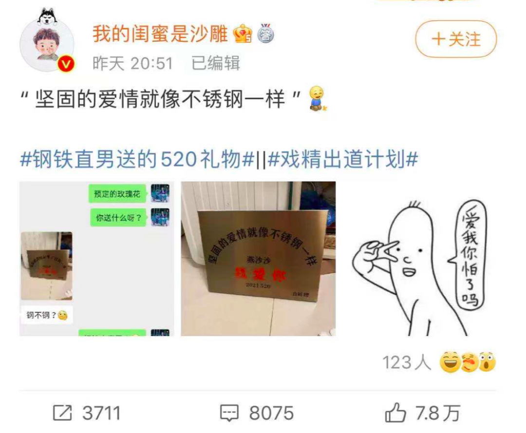 3.而在情侣中,今年尤其关注“约会穿搭、礼物攻略“等话题,女生更关注“穿搭”,男生更关注“送礼”,钢铁直男的礼物也引起了网友的“热议”,晒出钢铁男友的“可气又好笑”的脑回路。