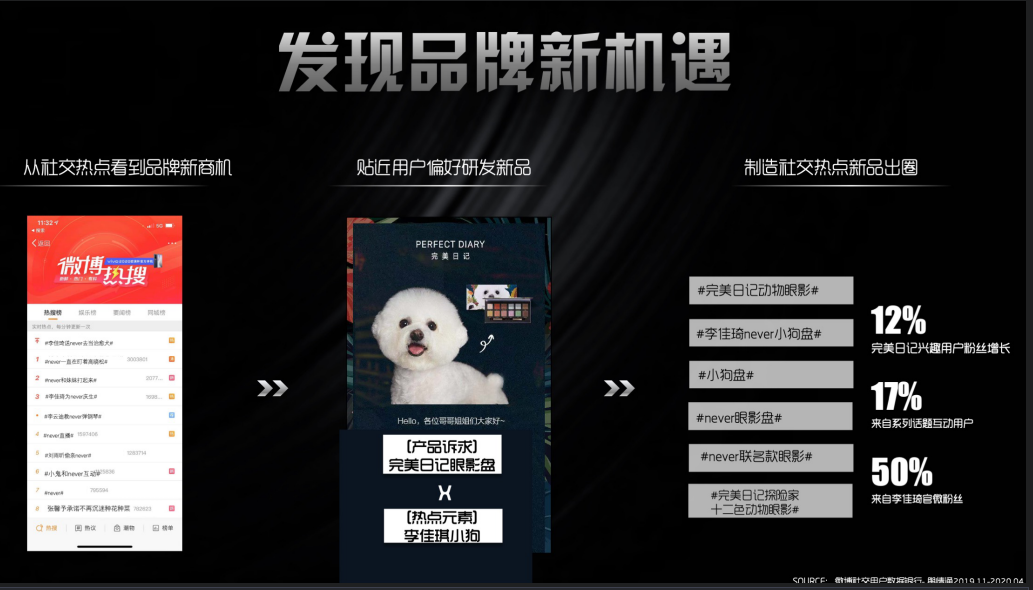 洞察到这一点的完美日记,借此社交热点顺势推出新品#小狗盘#、#完美日记动物眼影#,瞬间吸引了不少网友关注。通过微博数据银行分析发现,当“李佳琦宠物狗”与完美日记产品相碰撞结合时,品牌兴趣用户增长12%,其中50%来自李佳琦的官微粉丝,而围绕新品产生的一系列话题互动中也为品牌输入了不少潜在客群。