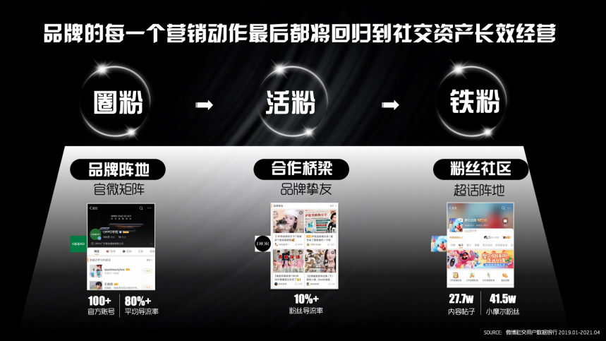 其实,品牌的每一个营销动作最后都将回归到社交资产长效经营。而在资产经营中,有三个核心关键点:圈粉、活粉和铁粉的养成。微博通过自身营销工具和产品的完善,帮助企业撬动三个关键节点效能。