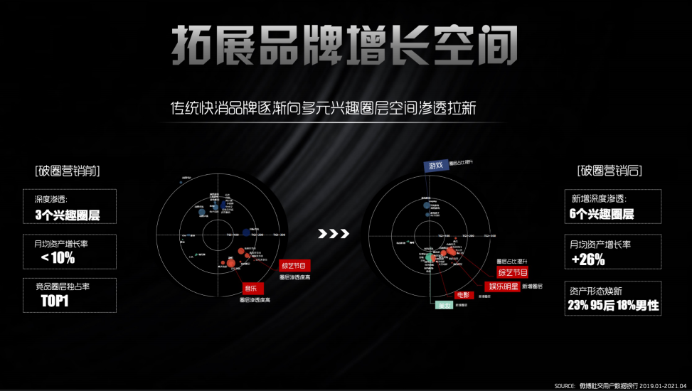 微博以其丰富的圈层价值和独特的社交平台属性,帮助品牌A发现更多新的圈层机遇,为其带来了新的增长空间。而且,在破圈扩展过程中,企业与用户的互动也会为品牌带来资产沉淀和用户沉淀。