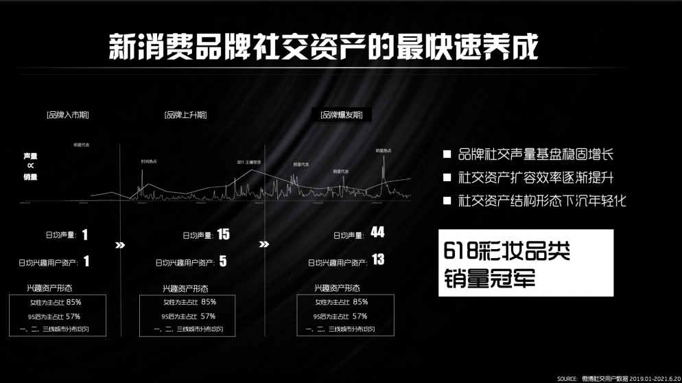 自其初入市场便在微博启动了品牌运营,吸纳用户反馈来进行产品升级;而进入上升期后,围绕自己清晰的品牌定位,在微博与明星、IP展开深度合作,为品牌积累了优质用户资产和内容资产;迎来爆发期后,基于前期的沉淀,品牌声量实现了44倍增长,日均用户资产也增长了13倍。