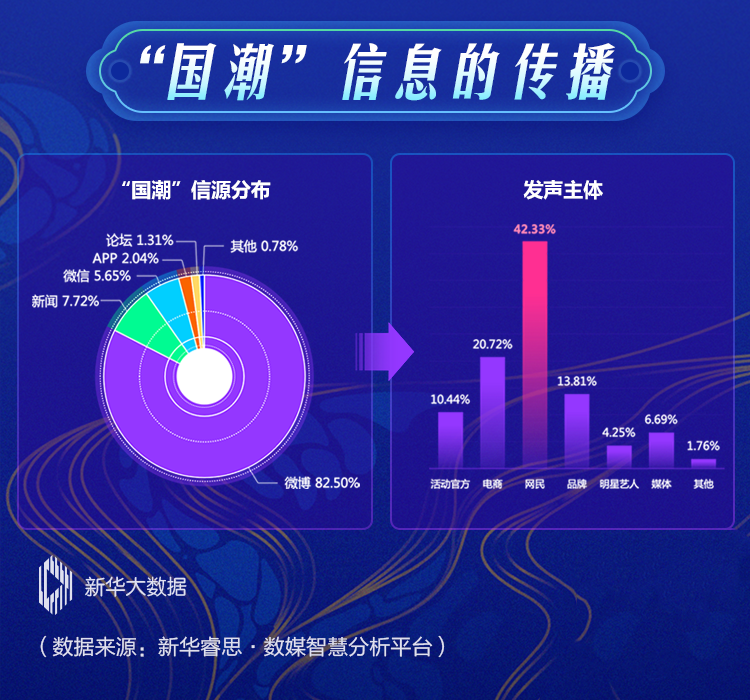 在这种民族情感崛起的市场态势下,“国潮”文化一路乘风破浪,成为当下最火热的潮流之一。随着不断发展,“国潮”内涵也越来越多元,它既是新兴消费趋势,又是前沿文化潮流。而据新华网数据显示,微博平台是“国潮”信息传播和讨论的主要阵地,占比高达82.5%。发声主体中,网民是“国潮”信息传播的主力军。