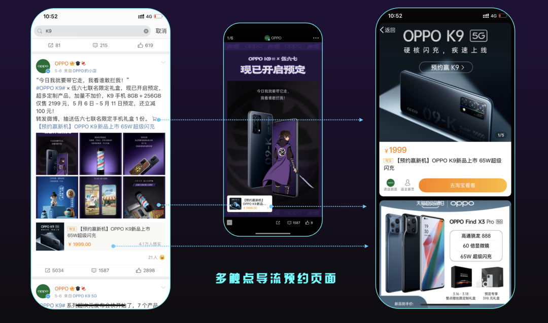 在惊喜连连的超次元发布会后,“预约”好戏正式上演。在发布会当天,OPPO通过超级粉丝通边X系列多触点引导用户预约联名礼盒。在外层展现方面,以图片六宫格形式展现#OPPO K9# x 伍六七联名限定礼盒,如手机、暗影刺客令牌手机壳、爆裂街霸蛋盲盒以及专属定制动态主题壁纸等新品卖点。粉丝可以通过博文链接、预约组件、图片详情等入口,跳转到新机预约页面进行预约购买。