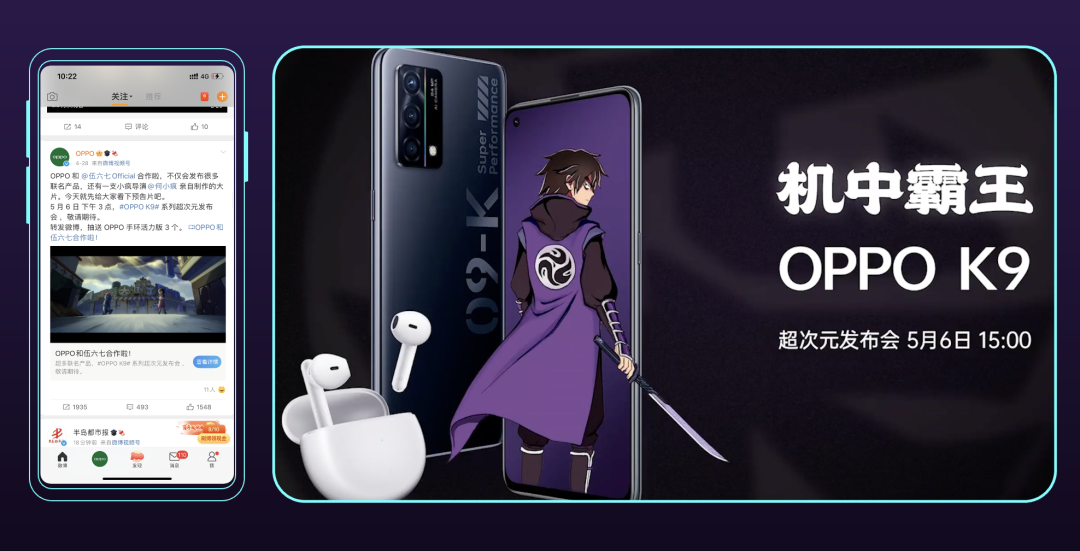 在正式发布会开始前一周,OPPO通过官方微博发布了与国漫之光@伍六七Official“牵手”合作的消息,并且通过超级粉丝通卡片视频样式,灵动的呈现了由@何小疯导演亲自操刀的预告大片,阐释OPPO K9“机中霸王”的产品定位。
