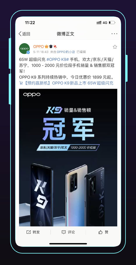 产品一经推出,K9手机便拿下了欢太、京东、天猫、苏宁四大平台1000-2000元价位段手机销量&销售额冠军。OPPO乘胜追击,将产品销售战报继续通过原生博文的形式,展现给前期各阶段具有高互动特质的优质人群,进行人群的二次激活。以真实的销售结果为营销素材,极大的刺激了有购买欲望但仍在犹豫不决的用户,让他们将心动化为行动。