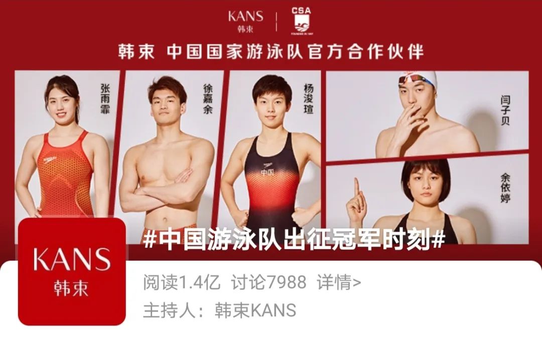 贴合年轻人的热爱,与年轻人们进一步产生了情感共鸣和现实意义,众多网友也纷纷参与为中国游泳队打call,截止目前,韩束发起的#中国游泳队出征冠军时刻#话题阅读量已经超过1.4亿。