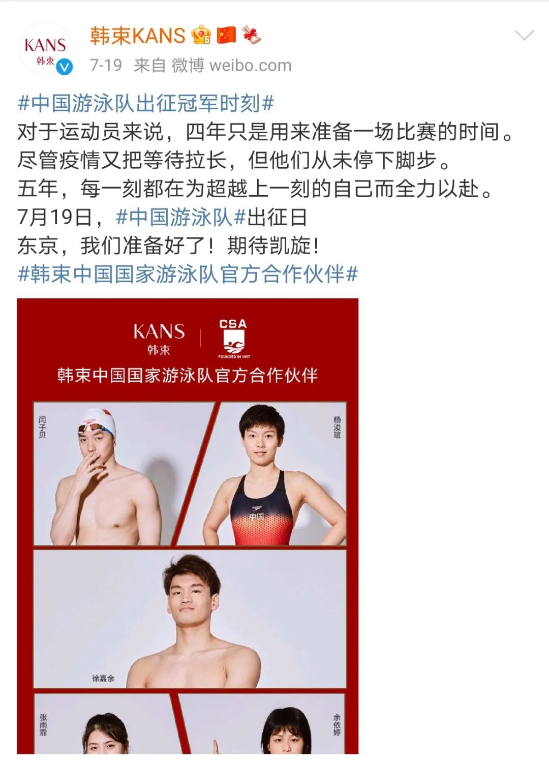 7月19日是中国国家游泳队奥运出征日,韩束在这个特别节点宣布更换代言人,显得仪式感十足,为国争光的国家队与旗帜鲜明的国货强强联合,顺应消费者期待助推品牌声量上升。