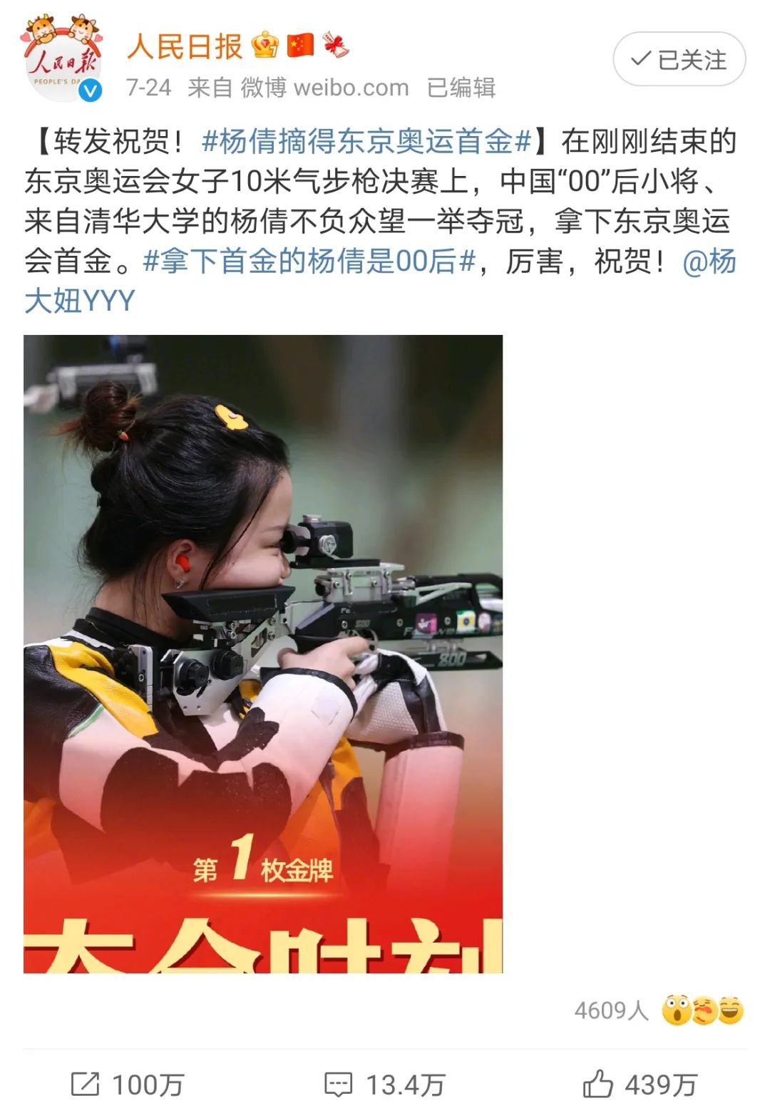 00后小将杨倩为中国代表团射落本届奥运会的首枚金牌后,@人民日报、@央视新闻、@新华社等奥运官方媒体第一时间报道,明星、大V纷纷转发祝贺,@清华大学 官微也发出贺信,揭开其学霸身份。