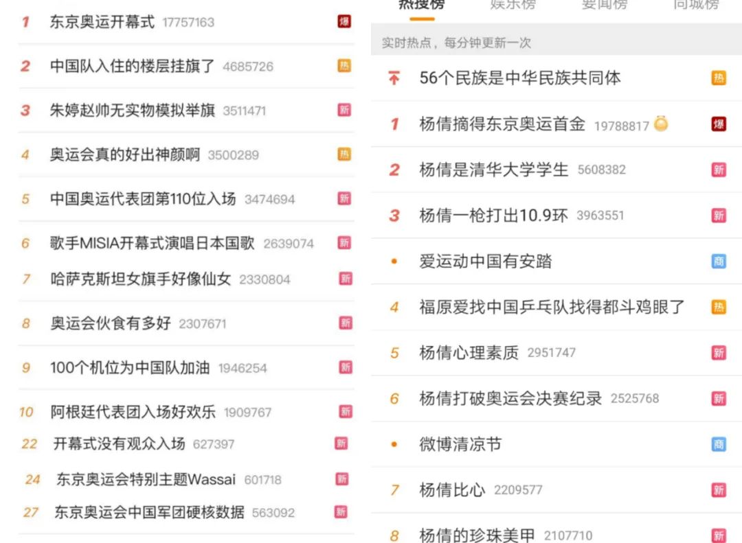 据统计,开幕式前后四个小时内,64个开幕式话题登上热搜,开幕式相关话题总阅读量达14.5亿,热搜话题词也反映出用户关注点的实时变化。杨倩夺得本届奥运会首金后,#杨倩摘到东京奥运会首金#话题迅速成为各大平台热议的焦点,与之相关的十余个话题也“霸占”微博热搜,总阅读量超30亿。