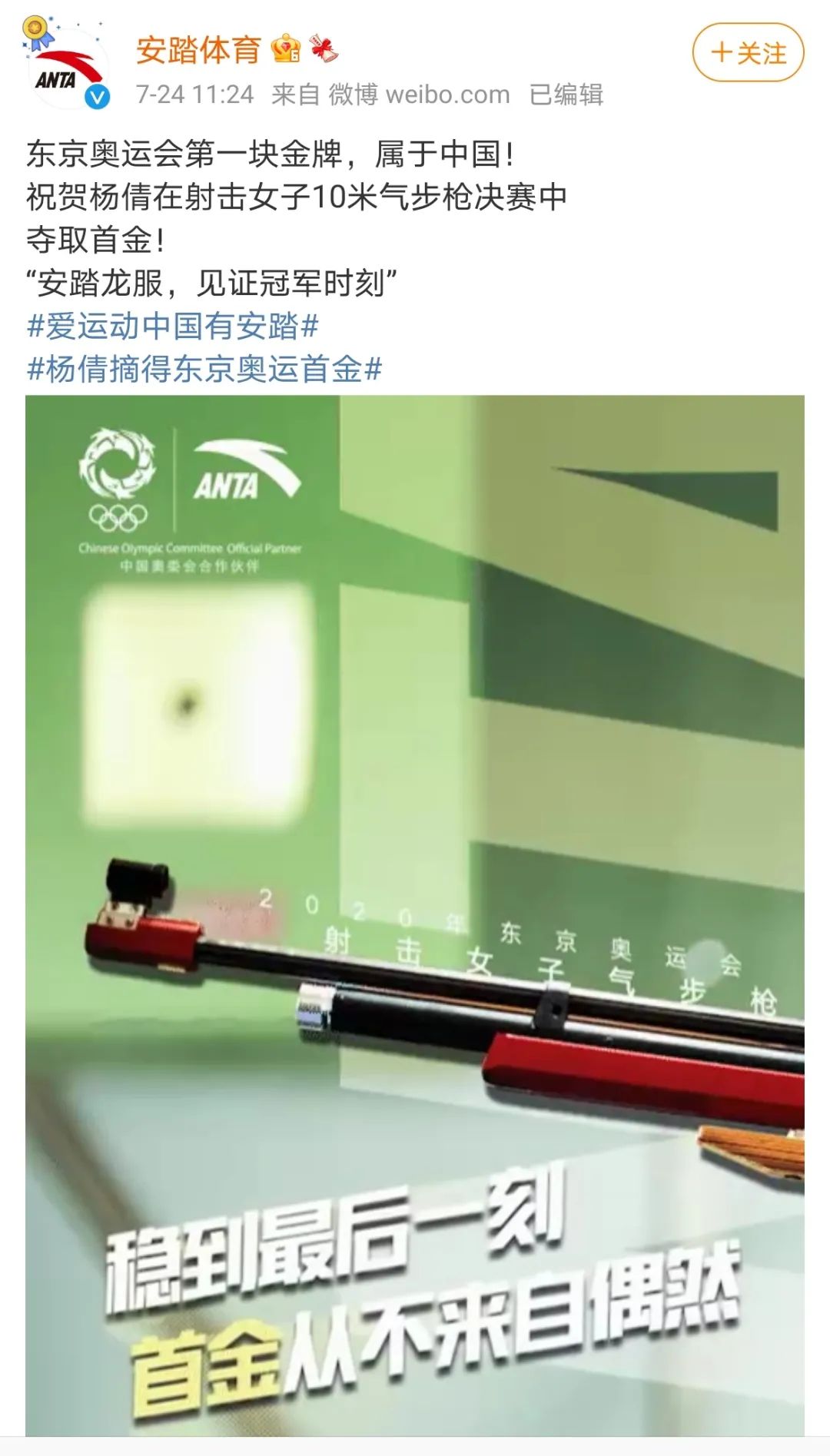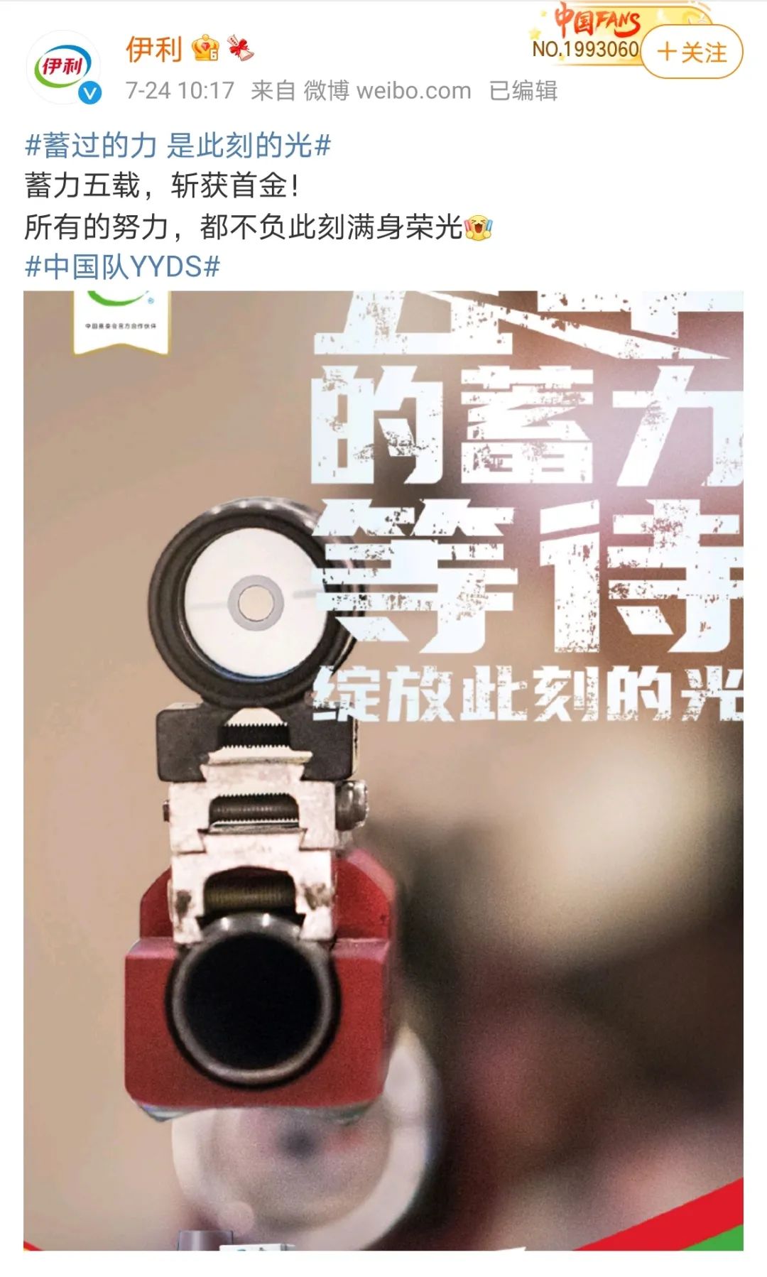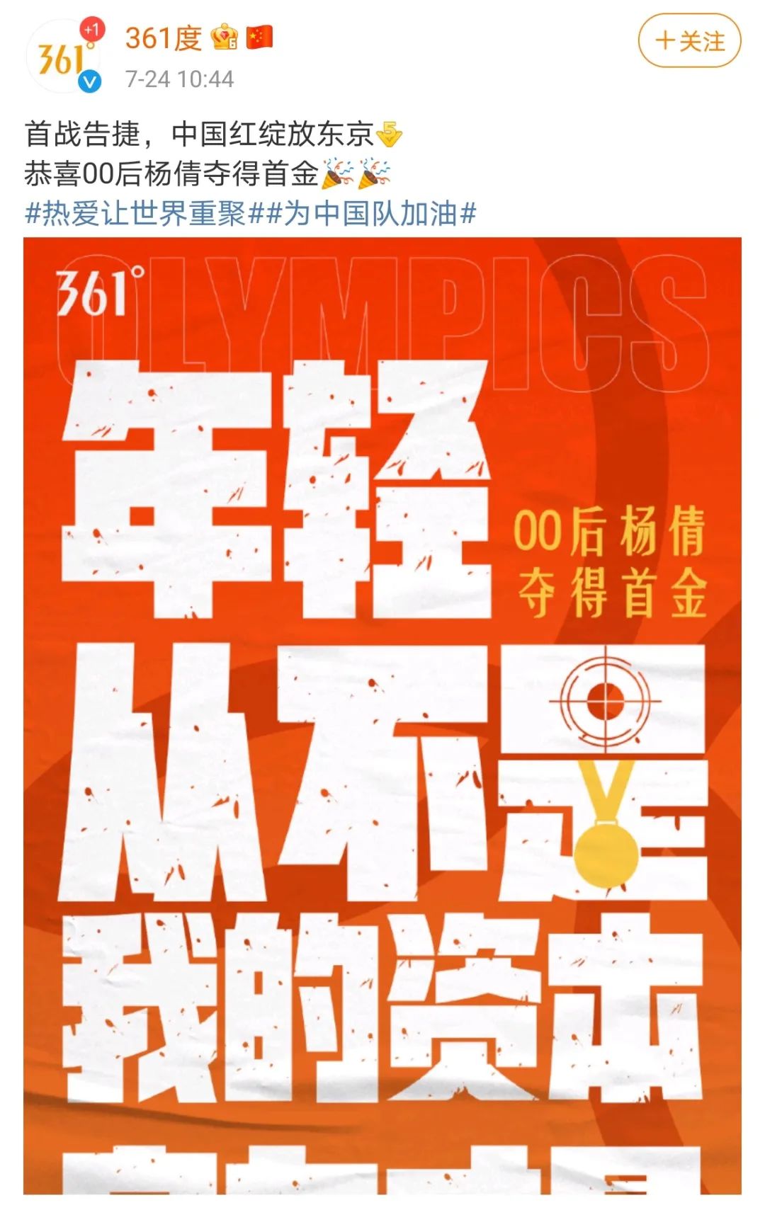 运动品牌@安踏体育 、@李宁官方微博 、@361度,电信数码行业@中国联通、@华为终端、@OPPO,汽车品牌@梅赛德斯-奔驰、@沃尔沃,乳业领头羊@伊利、@蒙牛、@君乐宝等各大品牌也迅速通过官方微博发布创意祝贺海报祝贺杨倩夺冠,“中国队yyds”“你也要成为国货中金牌啊,加油”“文案好棒,蓄过的力,是为了此刻的光”……网友们也在评论区与品牌互动表达内心激动之情。