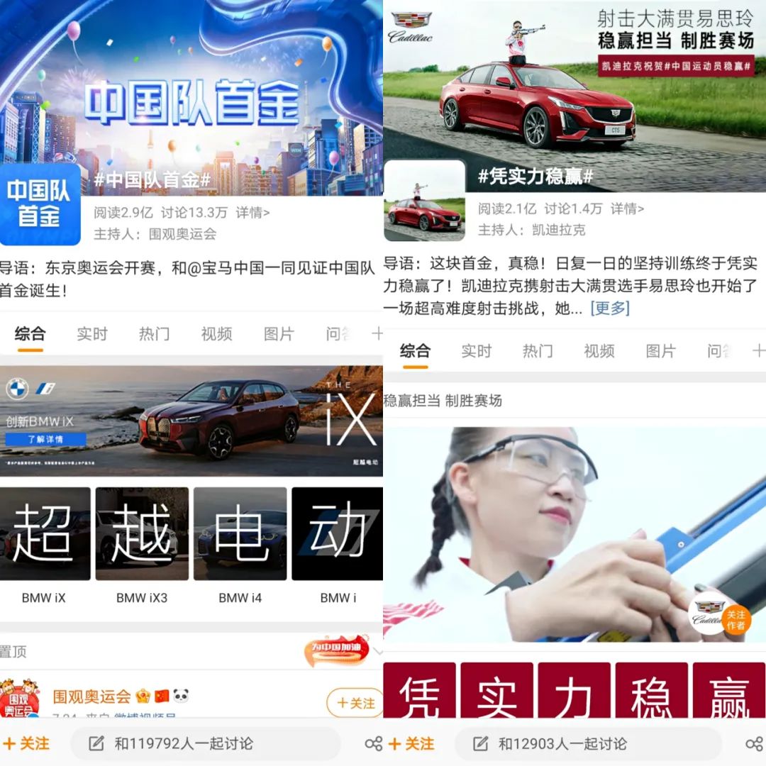 更有车企品牌@宝马中国 以及@凯迪拉克,为中国奥运首金定制了#中国队首金#和#凭实力稳赢#两个阅读量达到亿级的热门话题,不仅呈现出品牌信息,更建立了一个品牌社交阵地,吸引了大批官方账号和网友参与奥运会互动。
