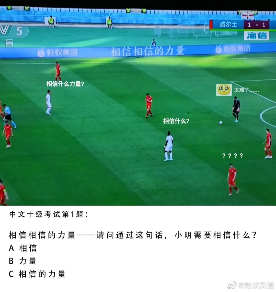 在本届欧洲杯赛事中,支付宝还充分利用“梗文化”进行品牌传播。官微以赛场内情形为创意制造“中文十级”梗,并抛出一个考察四六级英语翻译水平的问题,激发了网友的互动参与,顺利将大家的关注点转移至赛场边的“相信相信的力量”广告语。