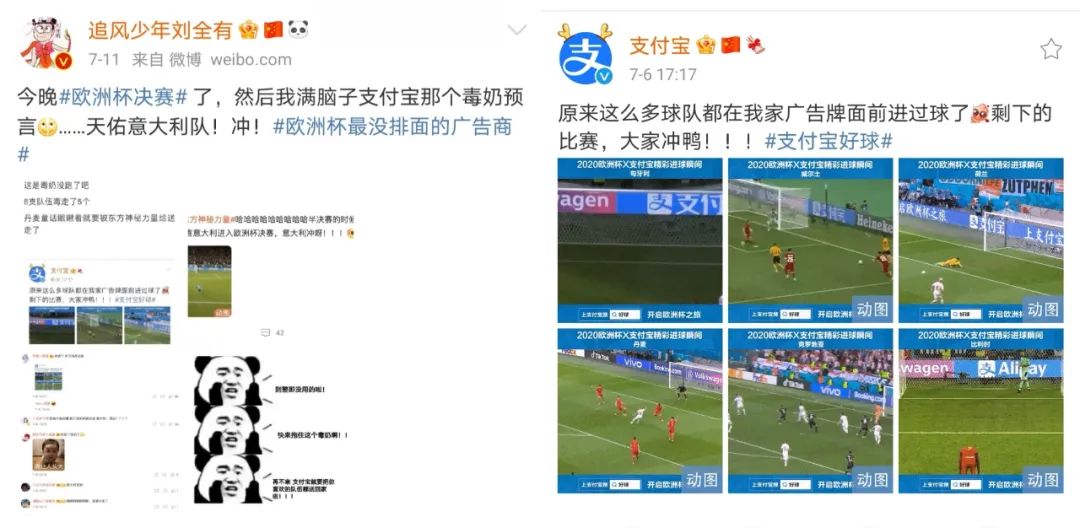 支付宝作为2020欧洲杯赞助商之一,场边广告的露出引发了网友巨大关注。相对于其他赞助广告网友感觉支付宝露出次数太少,#欧洲杯最没排面的广告商#话题成为网友的调侃,甚至微博大v也加入讨论,支付宝由此也收获一波“自来水”热度。