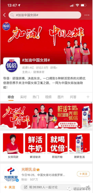 明星代言、内容营销、饥饿营销、恐惧营销……品牌面临各种营销方式或者广告诉求,但其实每一种营销方式都有比较严格的成立前提,不是屡试不爽的。奥运营销成立的前提首先是品牌的属性和奥运会非常契合;其次品牌为了奥运会做了相关贡献。比如上届奥运会光明乳业是中国女排的赞助商,而中国女排时隔12年再次获得奥运冠军,光明乳业的股票当天来了一个涨停板,成为里约奥运周期的大赢家之一。光明的成功也足见奥运营销的魅力,如果光明和中国女排一点关系都没有,只是假大空的为中国女排加油是一定达不到这样的营销效果的。所以今年东京奥运会,光明采用奥运营销依然有成立的前提,在微博上发起#加油中国女排#话题榜也收获了上亿的阅读关注。尽管中国女排前三战比赛失利(心疼女排姑娘三分钟),但随着比赛的深入会牵动着更多国人的注意力,光明发起的话题会持续发酵,大有看头。