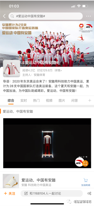 反观安踏选择做奥运营销,无论经验和还是资源都非常合适。安踏已经连续八届与中国奥组委,累计为28支中国国家队打造奥运装备,今年东京奥运会安踏为中国奥运代表团设计了领奖服“冠军龙服”。基于这样的基础,安踏推出一支#爱运动中国有安踏#的品牌广告,在微博上借势营销。从“稳到最后一刻,首金从不来自偶然”的主题海报,到“给我一个支点,我能举起全世界”,再到“石破添金,石至名归”,每一张营销海报都能获得了用户的认可。截止到7月28日,这个微博话题已经有4.2亿阅读,129.5万的讨论,安踏这波操作做的非常成功。