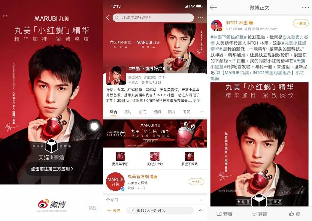 INTO1成立之后,林墨和米卡的影响力成倍增长,吸引了众多微博用户关注。与此同时,《微博2020用户发展报告》也显示,90后、00后在微博用户中占比80%,微博用户群体持续呈现年轻化趋势,也完美契合了品牌定位。因此,丸美选择微博作为此次618宣发主阵地便是自然而然的了。