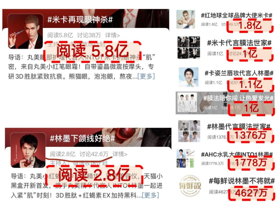 丸美结合代言人特点,先后建立#林墨下颌线好绝#和#米卡再现眼神杀#两大话题,并在当天官宣代言。同期,借微博开机报头广泛触达微博用户,通过明星超话深度激活粉丝参与,并通过粉丝团扩大影响力,完整的曝光链条引爆话题热度。最终两大微博话题的阅读量分别为2.8亿、5.8亿,领先当天所有微博热搜品牌!并远超林墨、米卡同期代言品牌的话题声量!