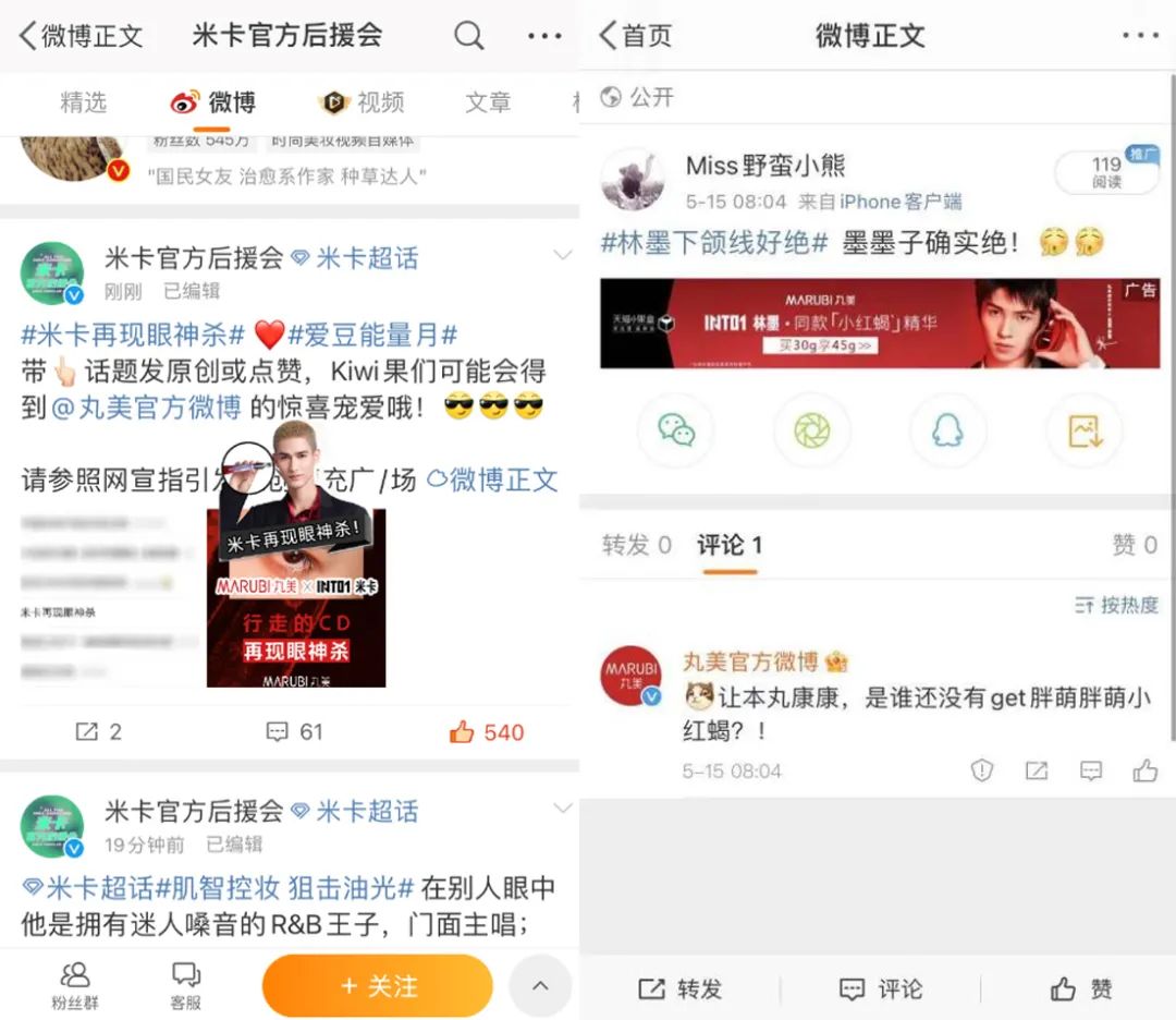 用户发布带有“林墨”和“米卡”的明星关键字的博文,就有一条来自丸美的原生评论,原生评论激发了粉丝的发博热情;另一方面,粉丝带话题发布博文,还可触发语义橱窗,直观展示产品信息。粉丝发博成声量扩散者,如此几何式的内容扩散,快速实现声量扩张和用户关注。