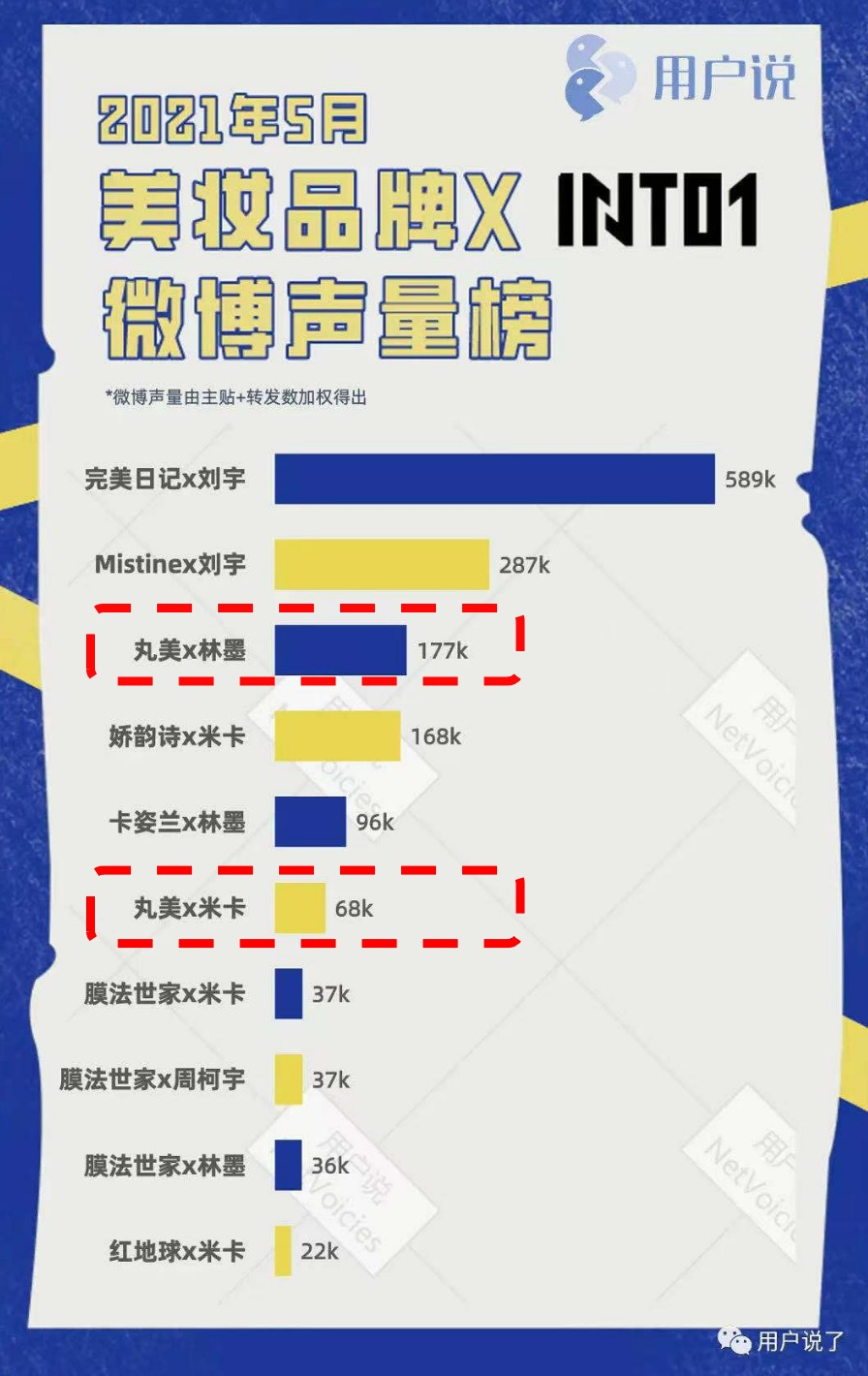 在微博平台官宣当月,美妆品牌X INTO1微博声量榜TOP10中,林墨和米卡占据了7席,其中丸美就占据了2席,丸美X林墨排在第三位,丸美X米卡排在第六位。