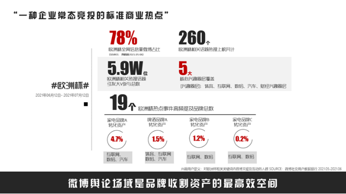 比如像奥运会、欧洲杯、新疆棉等等事件中,存在大量的品牌关键词、信息与内容的露出机会。抓住用户舆论场域的主流导向,利用好热搜与大V转发参与,能最有效的定向覆盖到比如体育、数码、财经等兴趣圈层,从而完成品牌资产的收割。