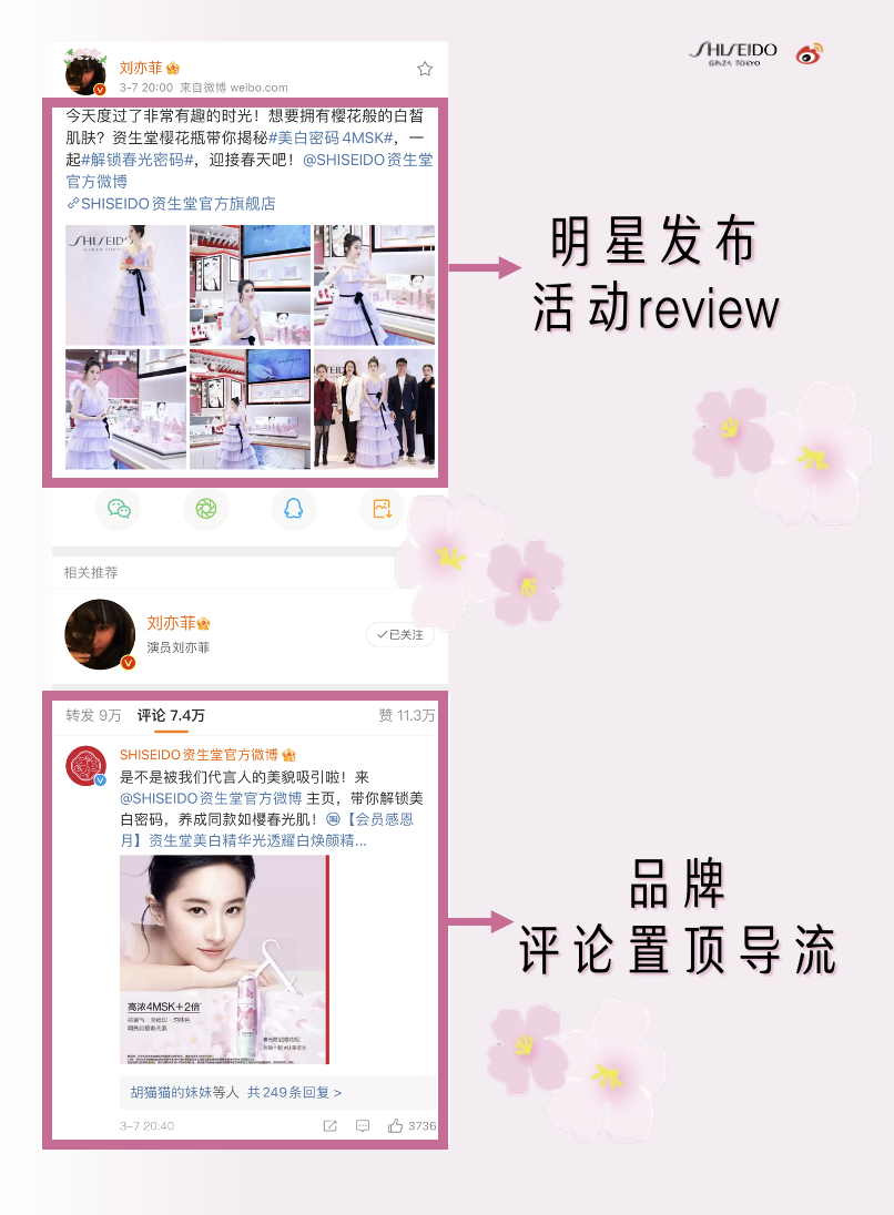 在本次campaign开启时,资生堂通过超级粉丝通卡片视频样式发布了代言人刘亦菲X樱花瓶的TVC,以美白黑科技和4MSK种草产品成分与功效,激活刘亦菲的铁杆粉丝。同时通过美妆KOL矩阵以边图边H5形式分享产品使用体验口碑,获得了超过整体水平近8倍的导流率,持续发力种草。