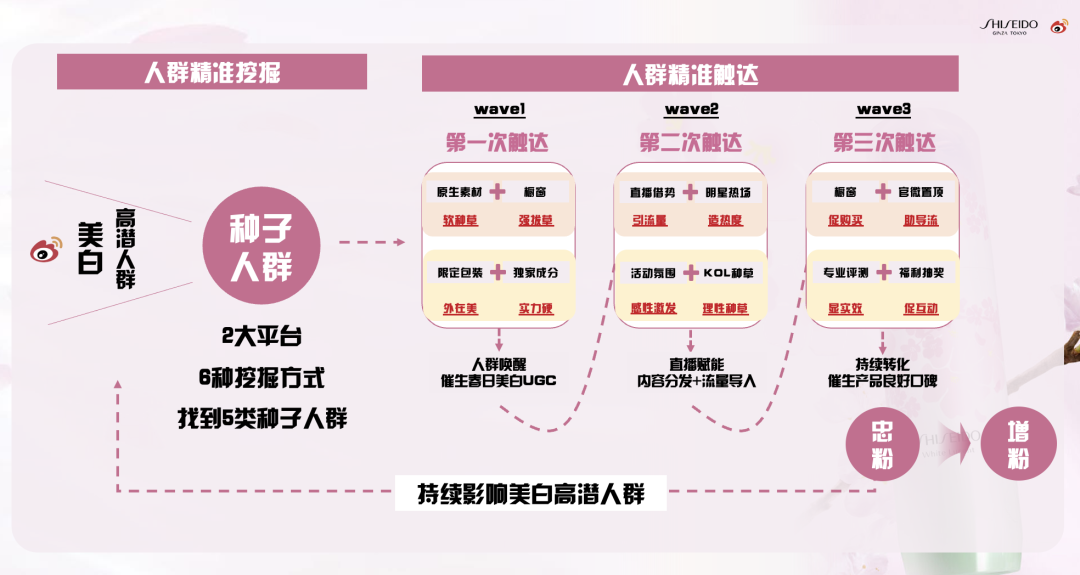 在找到合适的内容和合适的人群后,资生堂与微博合作,通过人群唤醒、直播赋能、长尾转化三波营销,使用多样化素材,有节奏地实现人群的有效覆盖和内容沟通。