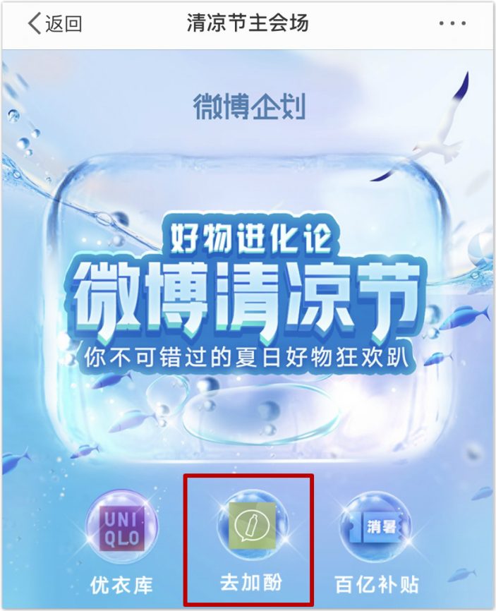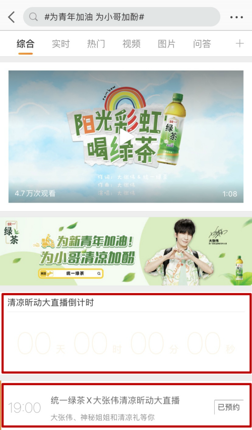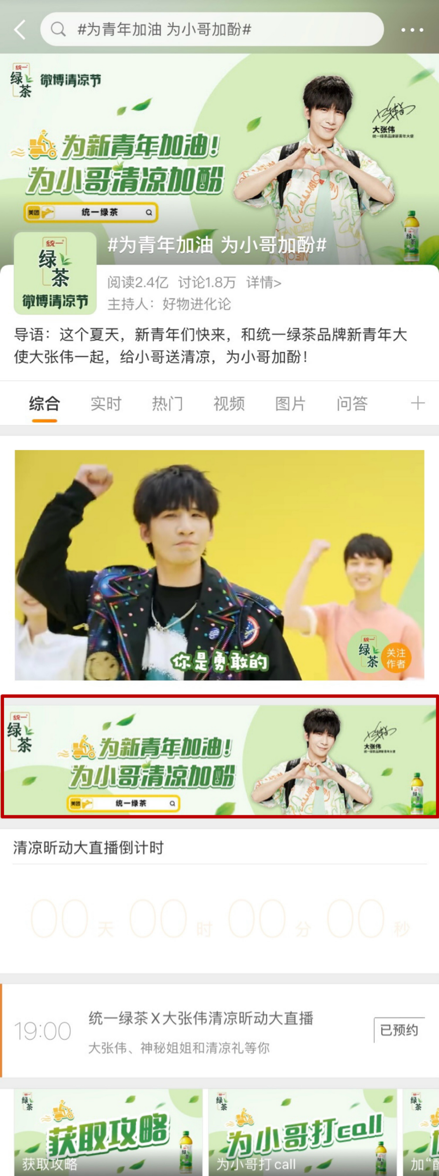 我们既可以在统一绿茶主话题的背景海报中看到微博清凉节的露出,在主会场看到统一绿茶的“加酚”标识。用户点击这一标识即可跳转至统一绿茶的解锁任务,这样的方式,将微博清凉节所覆盖的泛兴趣圈层人群成功引流至品牌自有阵地,扩大了活动影响力。