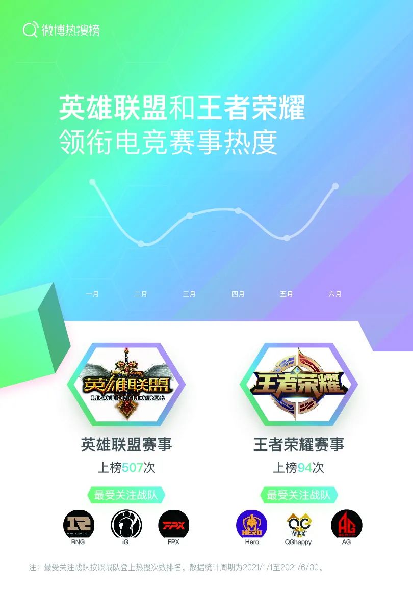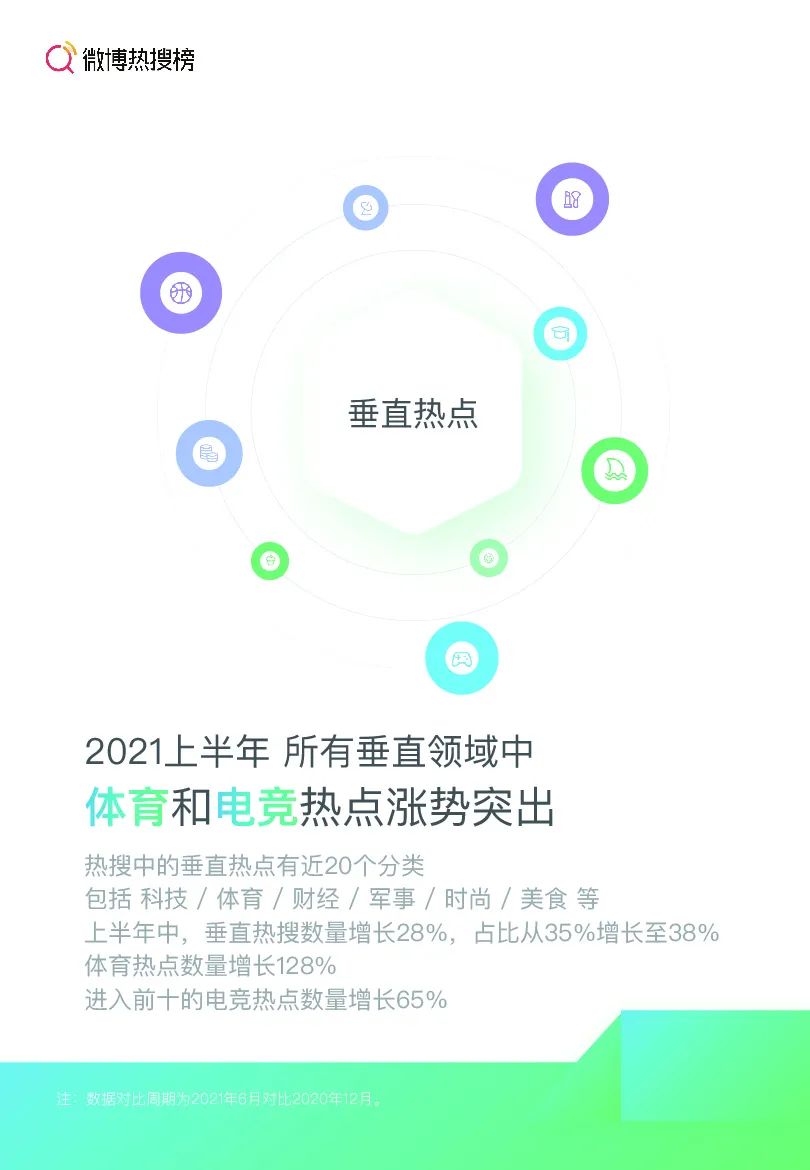 另外,垂直领域涨势突出。2021上半年,20个垂直领域中,热搜数量增⻓28%,占⽐从35%增⻓⾄38%,多样性大大增强。其中,体育热点数量增⻓128%,进⼊前⼗的电竞热点数量增⻓65%。