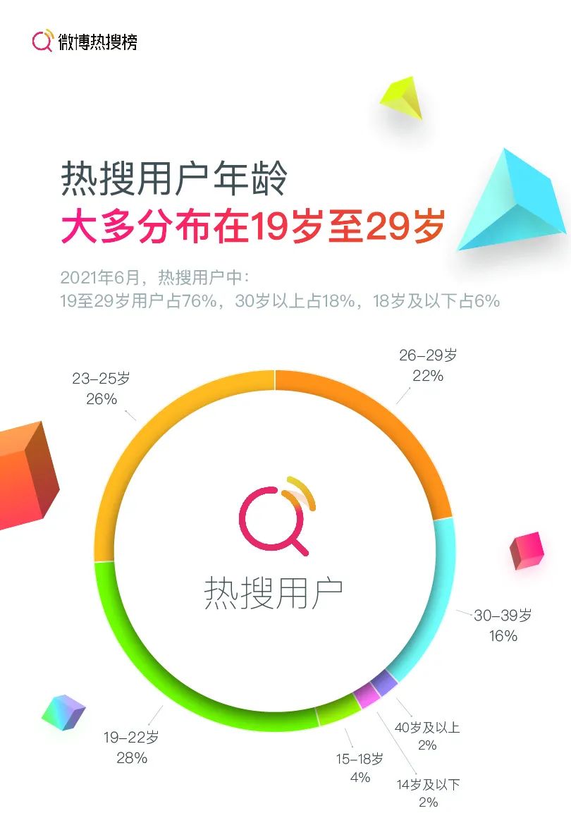 在引发全网关注的爆词方面,2021上半年热搜泛社会爆词达到27个,数量提升至9倍,占⽐从25%提升⾄39%,显著高于以往。从年龄分布上看,19-29岁是热搜的主要用户群体。