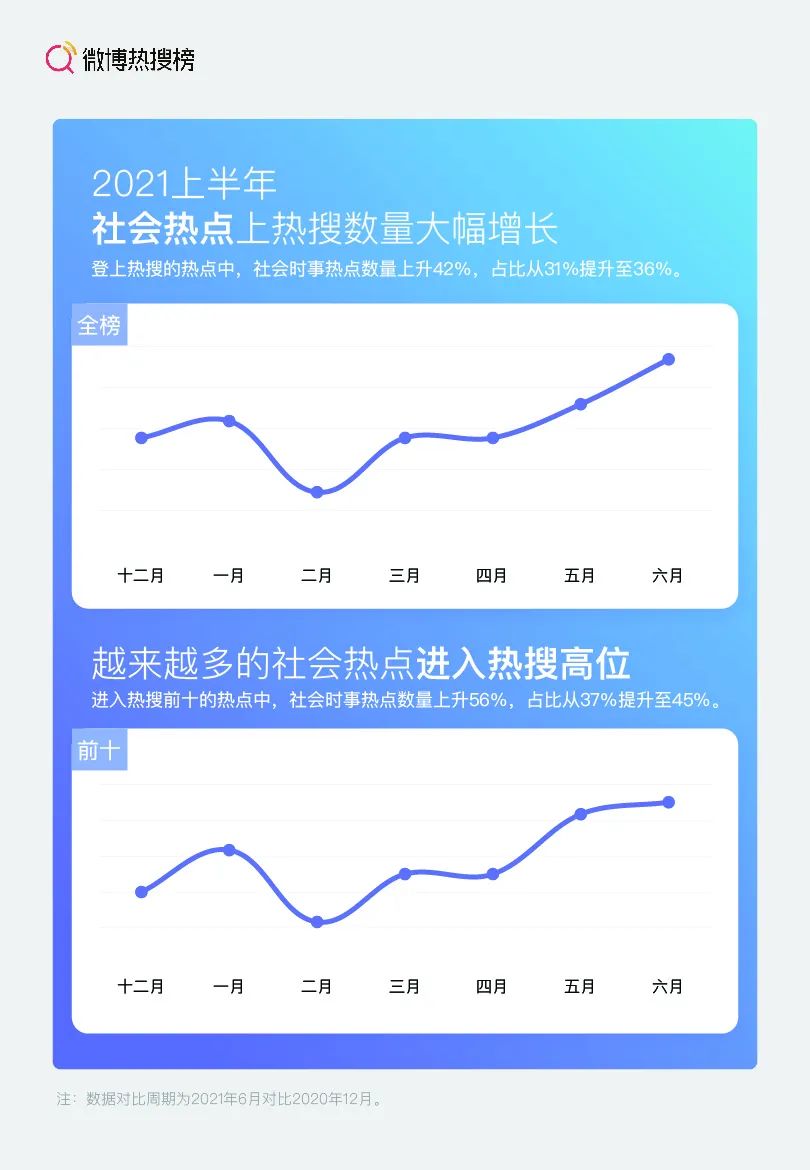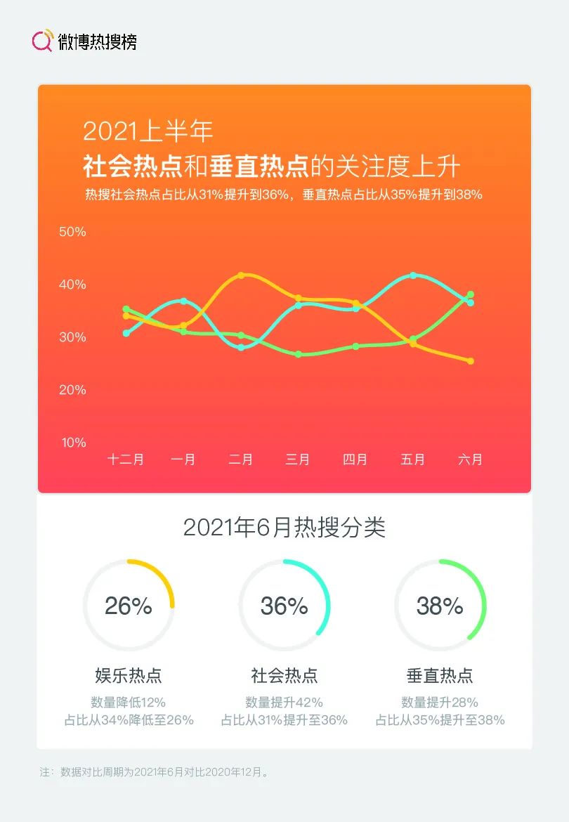 2021上半年,热搜中的社会热点占⽐从31%提升到36%,垂直热点占⽐从35%提升到38%,用户对社会热点和垂直领域热点的关注度在不断提高。