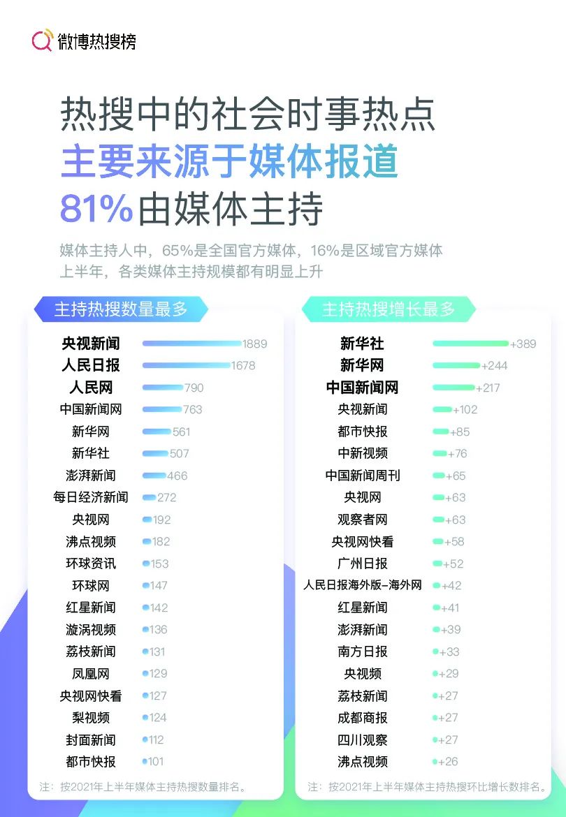 热搜中81%的社会时事热点来源于媒体报道,媒体主持⼈中,65%是全国官方媒体,16%是区域官方媒体。2021上半年,各类媒体主持规模都有明显上升。