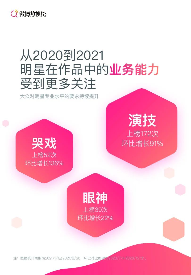 另一方面, 明星在作品中的业务能⼒受到更多关注,⼤众对明星专业⽔平的要求持续提升。其中,关于“演技”的热搜就上榜172次,环比增长91%。受⼤热剧综作品的带动,热搜明星人物的排行榜中也出现了不少新⾯孔。