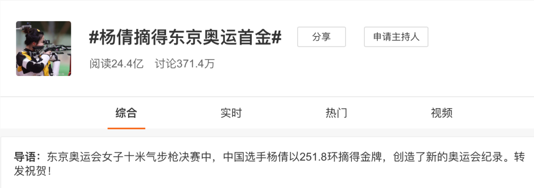 7月24日,奥运首个比赛日,世界排名81的杨倩意外的为中国队获得了首金,跟现场寥寥无几的观众形成千差万别的是杨倩一度占据了微博热搜前6的4席,在@人民日报、@央视新闻、@新华社等奥运官方报道媒体、以及@谢娜、@杨洋、@周深等明星大V的转发带动下,#杨倩摘得东京奥运会首金#的话题成为了当天微博平台最受舆论瞩目和热议的焦点,话题占据热搜榜第一位长达5个小时,阅读量达24.4亿,讨论量371.4万。