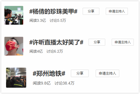 #杨倩的珍珠美甲#、#许昕直播太好笑了#、#郑州地铁#......