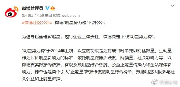 2021年8月, 微博宣布下线自己最重要的娱乐榜单之一——“明星势力榜”,这也是视为其为各种榜单去娱乐化的实质性动作。