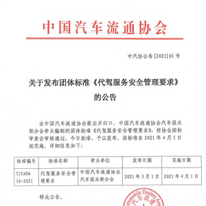 新浪科技讯 4月1日下午消息,《汽车代驾服务安全管理要求》团体标准发布会近日在北京召开。会上,中国汽车流通协会联合中国道路交通安全协会宣布,该标准于2021年4月1日起正式实施。