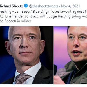 NASA将合同交给SpaceX,蓝色起源认为不公平,于是起诉NASA。SpaceX CEO马斯克第一时间转发消息,还配上一张图片,这张图片来自1995年的电影《特警判官》( Judge Dredd),图中配有文字:“你被审判了。”(You have been judged)。