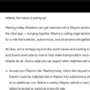 如今在亚特兰大,用户可通过优步叫到 Waymo 的机器人出租车。这两家已在奥斯汀推出 “Waymo on Uber” 服务的公司周二宣布,该商用服务初期将覆盖亚特兰大约 65 平方英里的区域。