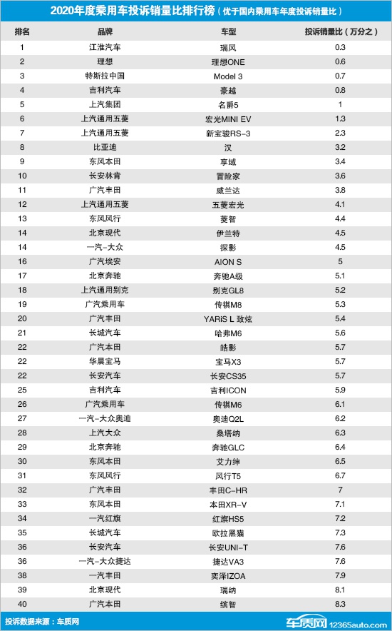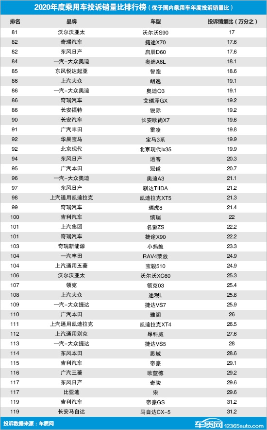 据国内领先的缺陷汽车产品信息收集平台车质网的统计数据显示,2020年国内乘用车年度投诉销量比为万分之31.9,均值连续三年出现上升,一定程度反映出国内乘用车整体质量口碑不容乐观。据统计,2020年共有164款车型超过了国内乘用车年销量平均值(30617辆),包括轿车71款,SUV车型84款,MPV车型8款,微面1款。其中,共有120款车型的数值表现优于国内乘用车年度投诉销量比,具体排名如下: