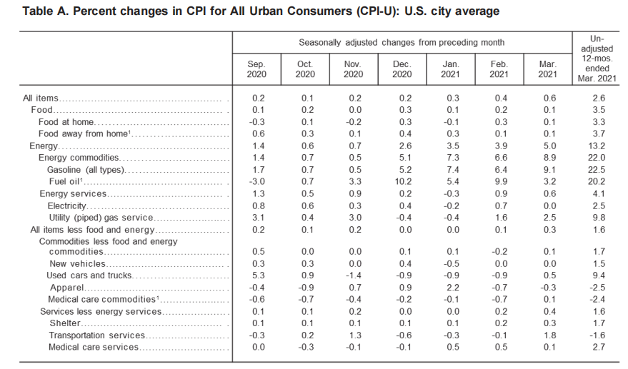 具体来看,美国3月CPI同比增长2.6%,创下2018年8月以来最高,预期增长2.5%,前值增长1.7%;3月CPI环比增长0.6%,创下2020年7月以来新高,预期增长0.5%,前值增长0.4%。
