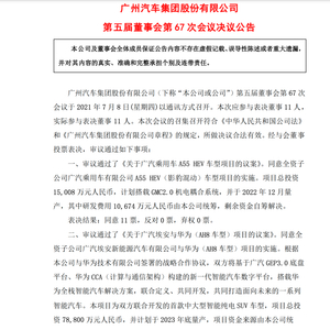 公告显示,根据广汽集团与华为签署的战略合作协议,双方将基于广汽GEP3.0底盘平台、华为CCA(计算与通信架构)构建的新一代智能汽车数字平台,搭载华为全栈智能汽车解决方案,联合定义、共同开发,共同打造面向未来的一系列智能汽车。项目为双方联合开发的首款中大型智能纯电SUV车型,项目总投资7.88亿元,并计划于2023年底量产,项目资金来源由公司统筹。