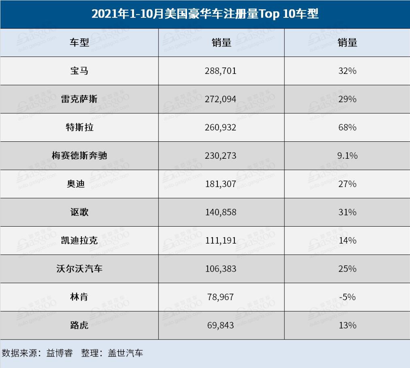 根据益博睿的数据,今年前10个月,特斯拉Model Y和Model 3也是美国注册量最高的两大豪华车型,超过传统燃油车型雷克萨斯RX (配置|询价)、奔驰C级和宝马3系。