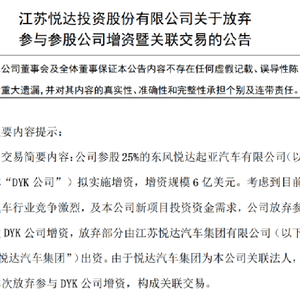 3月1日晚,悦达投资发布《第十一届董事会第五次会议决议公告》,公告显示,公司参股25%的东风悦达起亚汽车有限公司拟实施增资,增资规模6亿美元。而由于公司新项目投资资金需求,拟放弃参与本次东风悦达起亚汽车有限公司增资,放弃部分由江苏悦达汽车集团有限公司出资。由于悦达汽车集团为公司关联法人,公司本次放弃参与东风悦达起亚增资,构成关联交易。