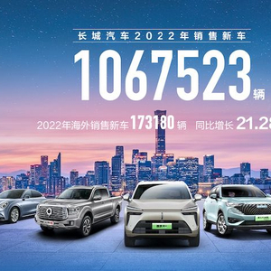 近日,长城汽车公布了最新的产销数据。2022年,长城汽车全年销售1,067,523辆,连续7年销量超100万辆。其中,海外市场累计销售173,180辆,同比增长21.28%,海外市场累计销量已超100万辆;20万元以上车型销量占比达15.27%,上升5个百分点;智能化进阶加速落地,智能化车型渗透率达86.17%。