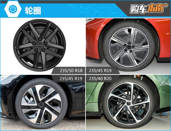 轮圈方面,星海S7根据配置不同,提供了四种轮圈样式。其中,555轻享版独占熏黑轮圈,视觉效果不错,但轮胎规格相对较小,规格为235/50 R18;555悦享版和555奢享版提供两种轮圈样式可选,均采用双色设计,轮胎规格同为235/45 R19;555共创版独占“旋风飞流”轮圈,更具视觉冲击力,与之匹配的轮胎规格为235/40 R20。